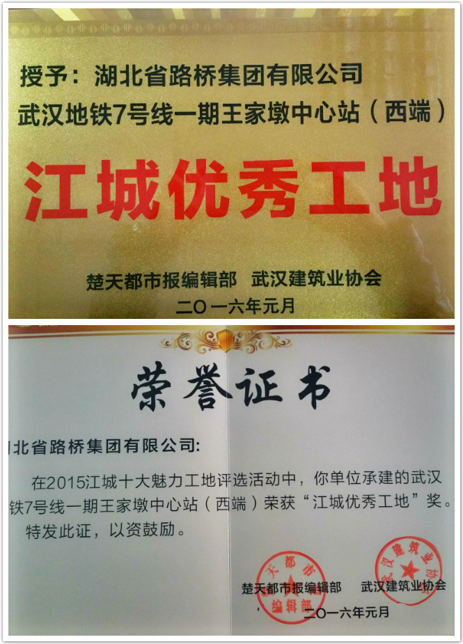 2016年1月17日下午,历时4个多月的"2015年江城十大魅力工地"评选活动结果揭晓,在武汉楚天传媒大厦举行颁奖仪式。湖北省路桥集团承建的武汉地铁7号线王家墩中心站项目,经过专家组实地考核、专业评审、楚天都市报公示等考评环节,最终从43家参评单位中脱颖而出,荣获"江城优秀工地"荣誉奖项。