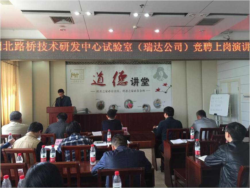为进一步深化公司人事制度改革,完善员工队伍的竞争、激励机制,公司于2016年4月18日下午2点,在三楼会议室举行了针对技术研发中心试验室(瑞达公司)中层副职和试验检测工程师岗位的竞聘上岗演讲会。