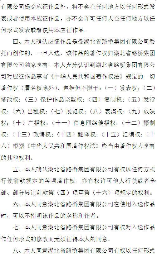 (一)应征设计作品必须保证拥有充分、完全、排他的著作权,不得侵犯第三方的任何权利。如有侵权行为,后果由作品提供者承担,湖北省路桥集团有限公司不承担任何责任。