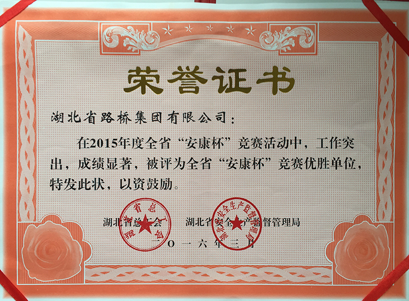 近日,从省总工会传来好消息,湖北省路桥集团被湖北省总工会和湖北省安全生产监督管理局联合授予2015年度湖北省"安康杯"竞赛优胜单位。