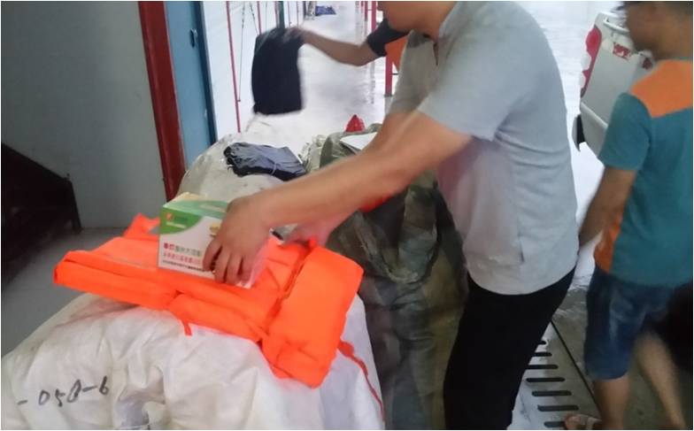 武穴长江大桥项目部,接到预警通知后,立即将救生衣等物资分发到每一位人员手上,并进行逃生培训。