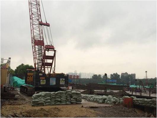 地铁7号线项目在强降雨来临前,用沙袋封堵车站预留出入口,开挖排水明沟,疏通排水管道。