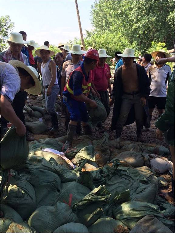 梧桐湖项目四面临水,强降雨导致湖水漫溢,车湾堤溃口,危急万分,项目部施工员通宵装填沙袋封堵溃口。