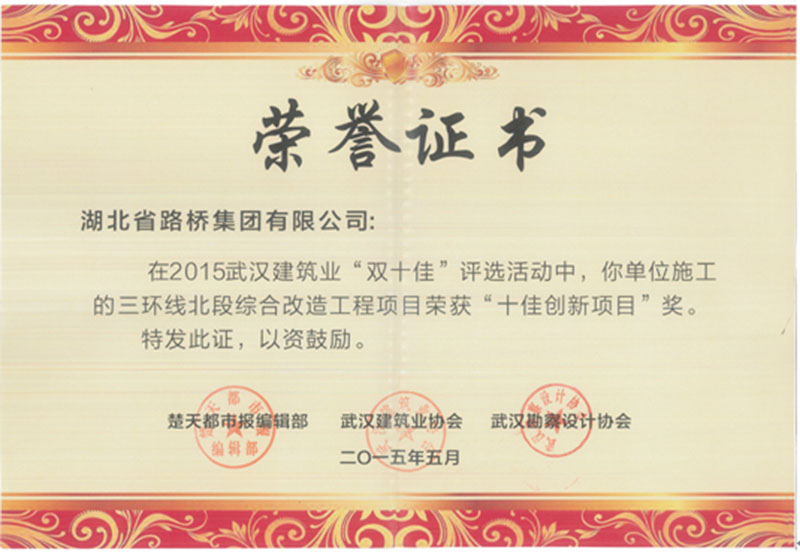 通过两年多的运营检验,三环线北段(长丰桥――平安铺)改造工程质量优良,使用功能等各项指标均满足规范及设计要求,被湖北省市政工程协会评为2016年度湖北省市政示范工程金奖。