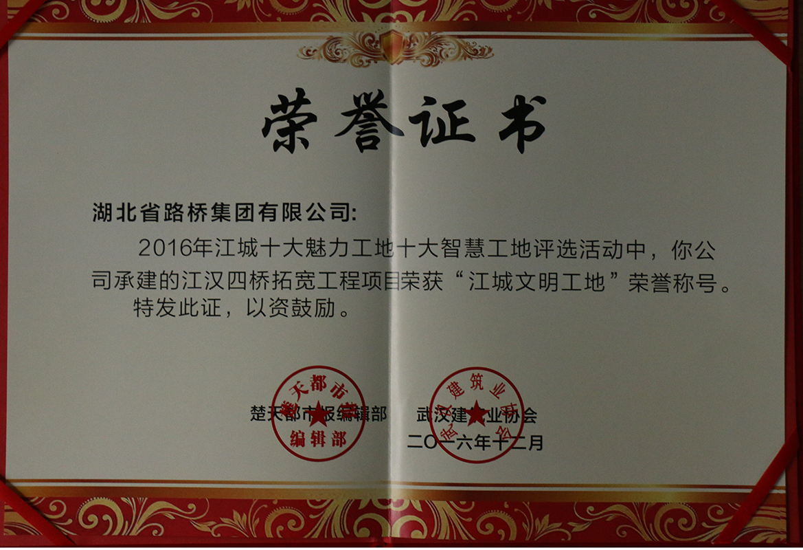 钢筋混凝土的丛林,如何绽放盎然的绿意?楼宇路桥的生长,如何闪烁文明的光芒?12月25日,2016年江城十大魅力工地十大智慧工地评选颁奖典礼在楚天传媒大厦举行,联投湖北路桥集团江汉四桥拓宽工程项目获评江城文明工地。