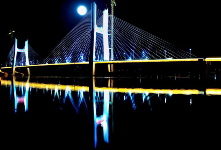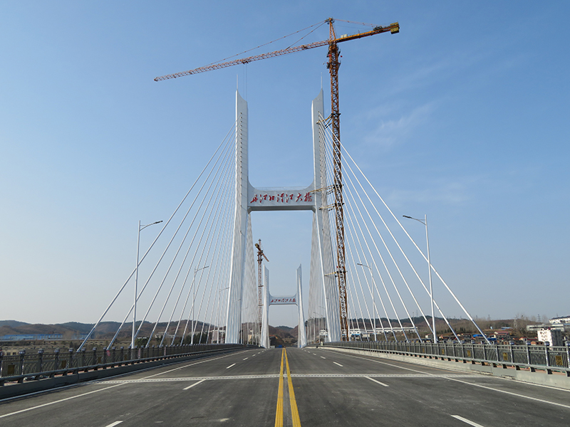 丹江口汉江公路大桥位于丹江口大坝下游6km处,南接丹沈路,北接沿江大道(孟土路),是丹江口市一座地标性建筑和生态景观桥,也是丹江口市重点项目之一。该桥为双塔斜拉桥,全长929米,其中大桥长760米,桥面宽24.5米,采用一级公路标准,设计车速80km/h,投资总估算4.4亿元。大桥的建成对推进丹江口市"一江两岸"规划的总体实施,进一步加快城市建设,改善投资环境,拓展城市发展空间均有重大意义。