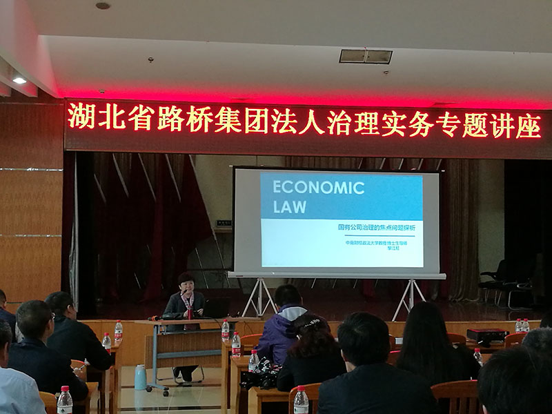 为进一步提高公司法人治理水平,使公司各个层面对公司法、混合所有制改革的相关内容有更多的了解,2017年4月25日下午,公司邀请中南财经政法大学法学院副院长黎江虹教授为公司员工讲授了"国有公司治理的焦点问题探析"专题讲座。公司常务副总经理丁峻,副总经理李高磊、万勇,总经理助理朱红明以及各子公司董监高、各分公司负责人、各分子公司综合部负责人及机关全体员工参加了培训。