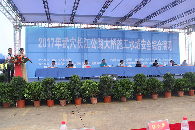 6月28日上午,由武穴市人民政府举办的2017年武穴长江公路大桥施工水域安全综合演习在武穴长江大桥WX-1标成功举行,武穴长江公路大桥WX-1标项目部为主要协办单位之一,担任本次演习的总指挥是武穴市人民政府市长李新桥,本次演习的副总指挥是武穴长江公路大桥有限公司董事长汪西华、黄石海事局局长温盛章、长江航运公安局黄石分局局长刘晶洲,现场总指挥是黄石海事局副局长邓华祥、九江海事局副局长王良勇、长江航道局局长张国强。