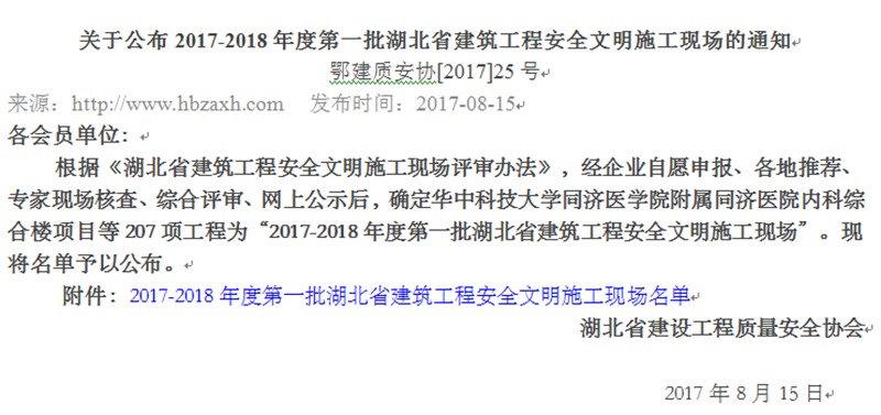 该项目获得湖北省建筑工程安全文明施工现场的荣誉,是路桥集团房建板块首次获得省级荣誉。