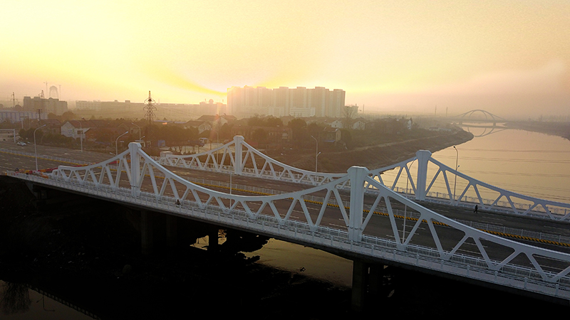 新桥长110米,宽44.5米,桥两端共125米接线,双向八车道,设计时速60公里每小时,桥梁形式为30+50+30m预应力混凝土连续梁+钢桁组合梁结构。采用变高三角桁架,将桥塔顶端设计成层次分明的向上喇叭状造型,与起伏交错的桁架组合,呈现出"鲲鹏展翅"的景观意象,凸显"开放、进取"的规划理念。