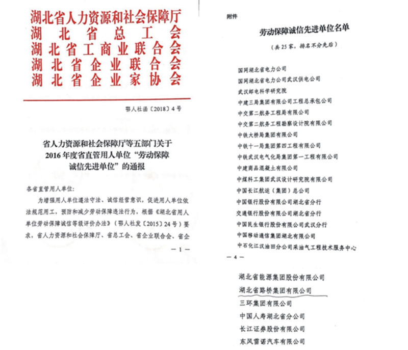 近日,湖北省人力资源和社会保障厅、湖北省总工会、湖北省工商联合会、湖北省企业联合会、湖北省企业家协会五部门联合发文,公布了2016年度省直管用人单位"劳动保障诚信先进单位",评定"国网湖北省电力公司"等25家单位为2016年度劳动保障诚信先进单位,湖北省路桥集团有限公司荣膺其中,获得了考核小组的高度评价。