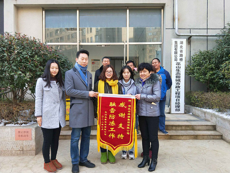 2月6日,武汉名景保洁有限公司将一面写有"感谢支持融雪防冻工作 "的锦旗送到湖北路桥花山市政工程项目部,感谢项目部全体成员1月26日至1月29日义务除雪除冰暖心行动。