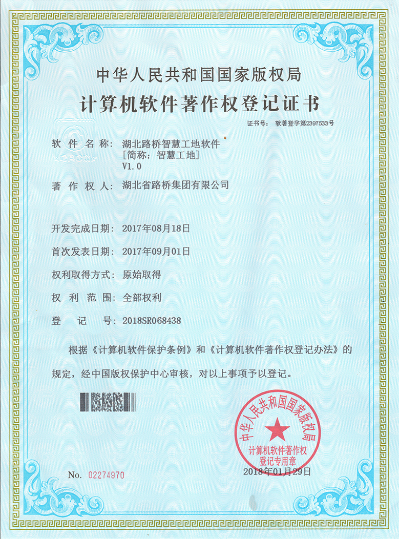 新春伊始,公司申报的"湖北路桥智慧工地软件V1.0"成功荣获了中华人民共和国国家版权局颁发的"计算机软件著作权登记证书",为路桥集团的科技创新之树添一抹新绿,这是公司首次自主申报获得的软著证书!