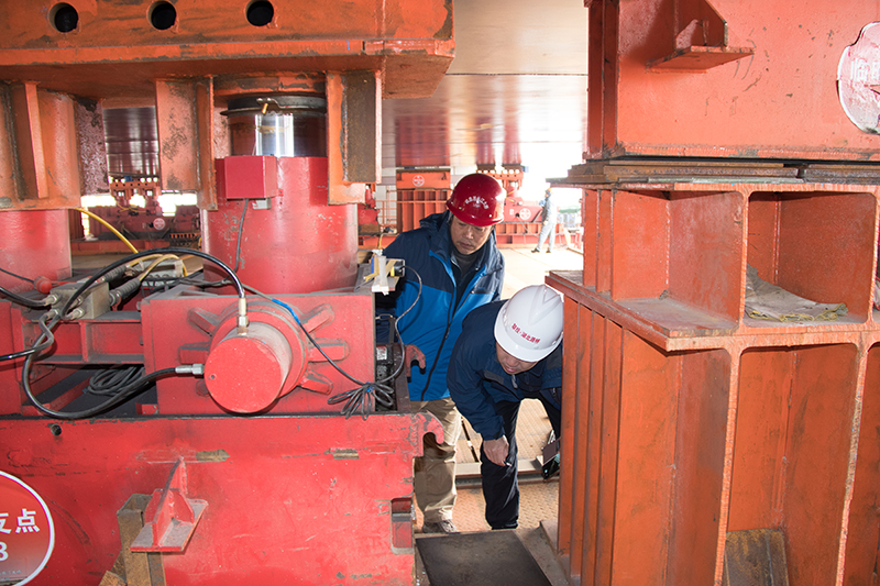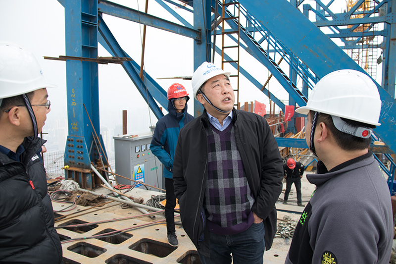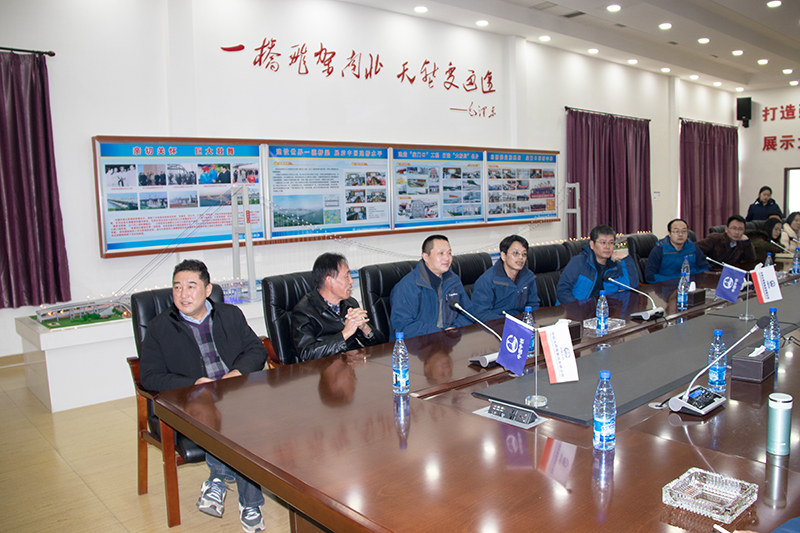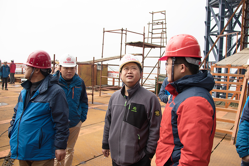 蔡明征一行来到青山长江大桥二分部会议室、荣誉室,观看了项目宣传片,了解工程概况,体验先进企业文化氛围;深入青山长江大桥北岸(20号墩)边跨施工现场,详细了解了步履式顶推工艺、施工组织、顶推机械设备等情况。结合棋盘洲长江大桥和沧浪洲湿地步行桥的顶推方案,围绕如何统一部署,发挥技术和设备优势,更好的服务施工生产,蔡明征一行与青山桥项目技术人员进行了深入探讨和交流,并听取了技术、安全、质量等方面的诸多实用、专业性的意见。
