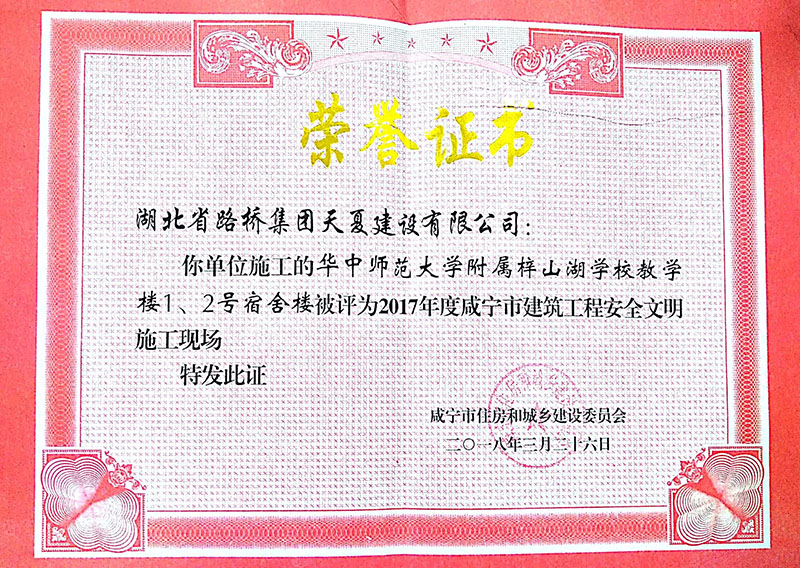 3月26日,咸宁市住房和城乡建设委员会公布了2017年度咸宁市建筑工程安全文明施工现场(桂花杯)的获奖名单,路桥集团天夏公司承建的华中师范大学附属梓山湖学校教学楼、1、2号宿舍楼工程喜获殊荣。