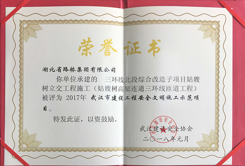 经过激烈角逐,湖北路桥承建的姑嫂树高架连通三环线匝道工程荣获"2017年度武汉市建设工程安全文明施工示范项目(黄鹤杯奖)"。