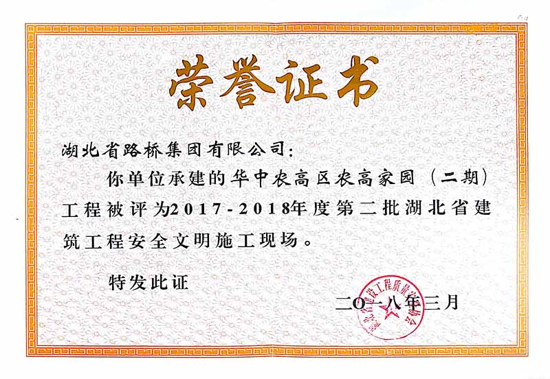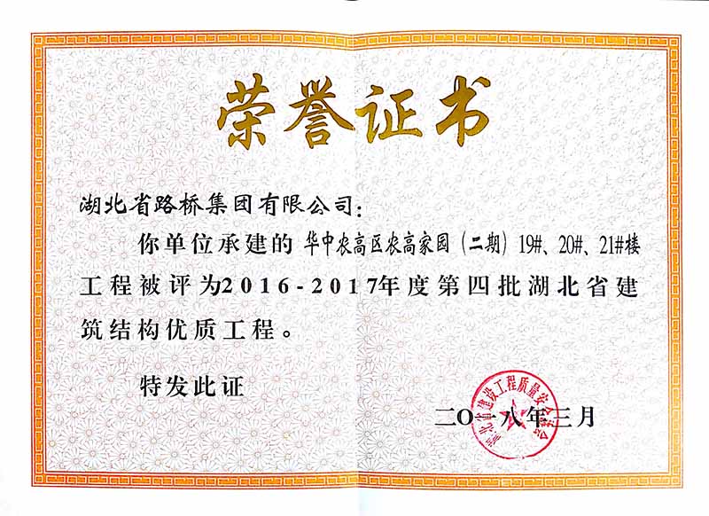 近日,从湖北省建设工程质量安全协会传来喜讯,经荆州建管部门推荐,省协会组织专家组现场核查、综合评审和网上公示后,由湖北路桥承建的华中农高区农高家园(二期)工程被评为"2017-2018年度第二批湖北省安全文明施工现场"(安全文明楚天杯),同时该项目的19#、20#、21#楼工程被评定为"2016-2017年度第四批湖北省建筑结构优质工程"(结构楚天杯)。