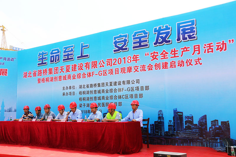 6月1日,湖北路桥天夏公司在梧桐湖创意城商业综合体项目部举行"安全生产月"活动启动仪式。公司董事长郭江庆、总经理吴海兵、副总经理朱正宏等领导,梧桐湖创意城商业综合体F-G区项目部、梧桐湖创意城商业综合体C区项目部、梁子湖区人民医院项目部等全体员工参加活动。
