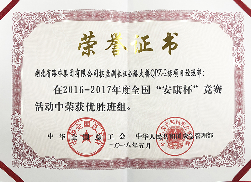 近日,中华全国总工会和应急管理部决定,授予湖北省路桥集团有限公司棋盘洲长江公路大桥项目部2016—2017年度全国“安康杯”竞赛优胜班组荣誉称号!此项殊荣充分肯定了湖北路桥扎实的企业安全生产主体责任落实以及安全管理建设工作!