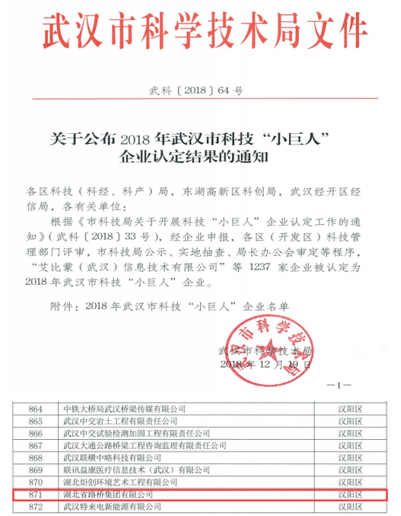 12月19日,武汉市科学技术局公布了2018年武汉市科技“小巨人”企业认定结果,湖北省路桥集团有限公司被认定为2018年武汉市科技“小巨人”企业。这是继公司年初获评认定湖北省企业技术中心后,顺势谋划的市级科技类荣誉。