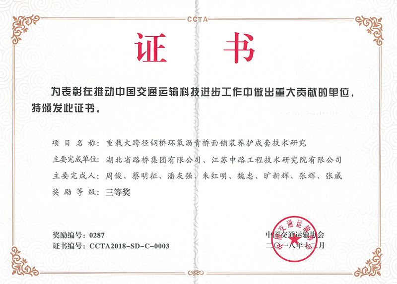 《重载大跨径钢桥环氧沥青桥面铺装养护成套技术研究》是由公司承担的湖北省交通运输厅科技项目课题,于2018年7月7日在武汉完成验收鉴定。该课题取得了多项创新成果,研究成果在湖北省阳逻长江大桥、鄂东长江公路大桥以及荆岳长江公路大桥实际工程中得到了成功应用,并取得了良好的经济效益。本次大会鉴定专家一致认为该项目成果总体达到国内先进水平,其中高韧性冷拌树脂钢桥面铺装养护材料及施工技术达到国际先进水平。