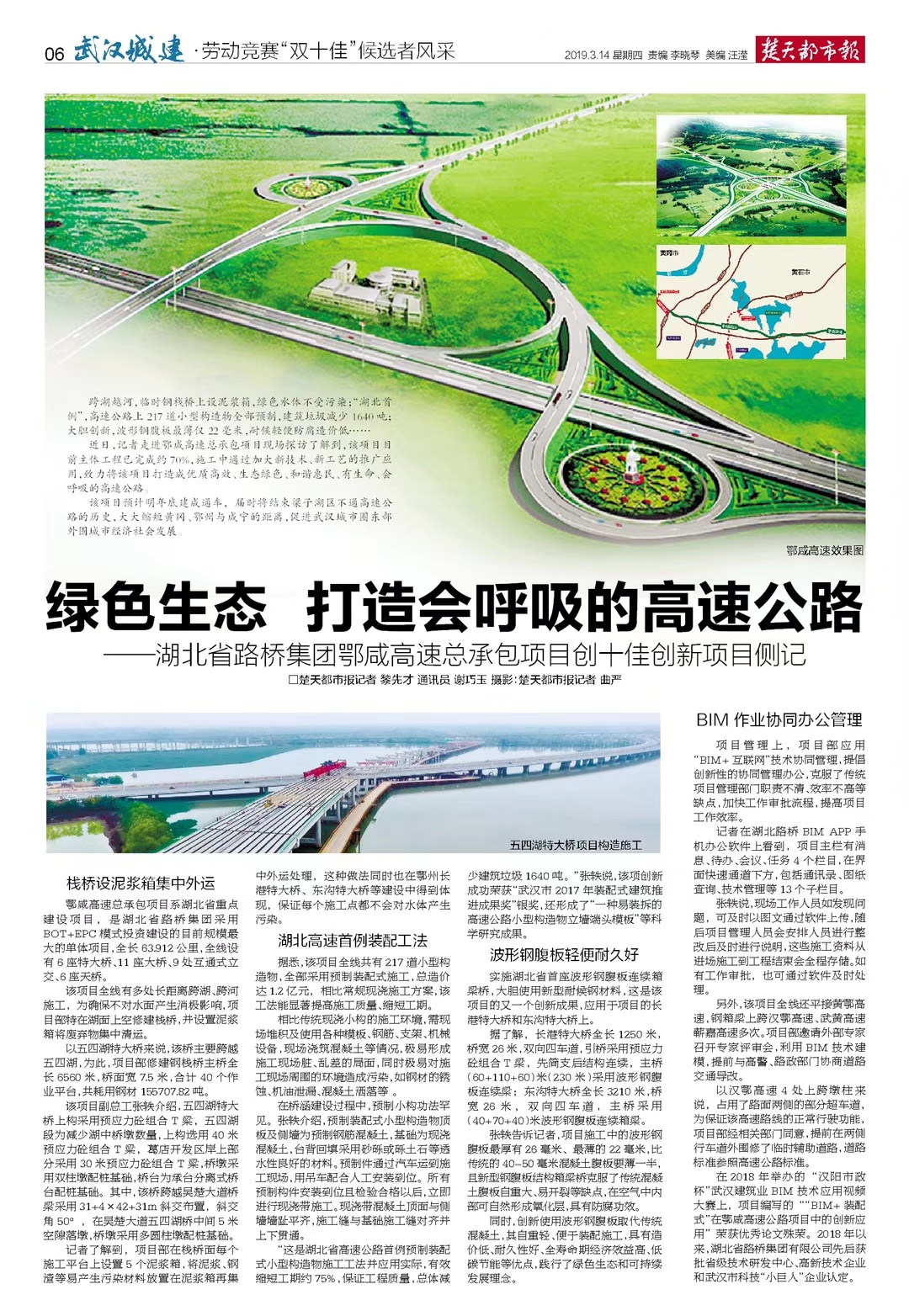 跨湖越河,临时钢栈桥上设泥浆箱,绿色水体不受污染;“湖北首例”,高速公路上217道小型构造物全部预制,建筑垃圾减少1640吨;大胆创新,波形钢腹板最薄仅22毫米,耐候轻便防腐造价低……