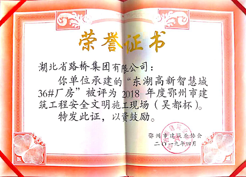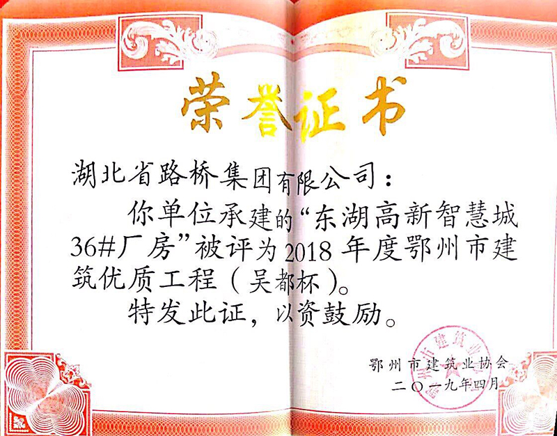近日,由湖北省路桥集团有限公司承建的东湖高新智慧城36#厂房项目喜获2018年度“鄂州市建筑工程安全文明施工现场(吴都杯)”、“鄂州市建筑结构优质工程”、“鄂州市建筑优质工程(吴都杯)”3项荣誉奖项。