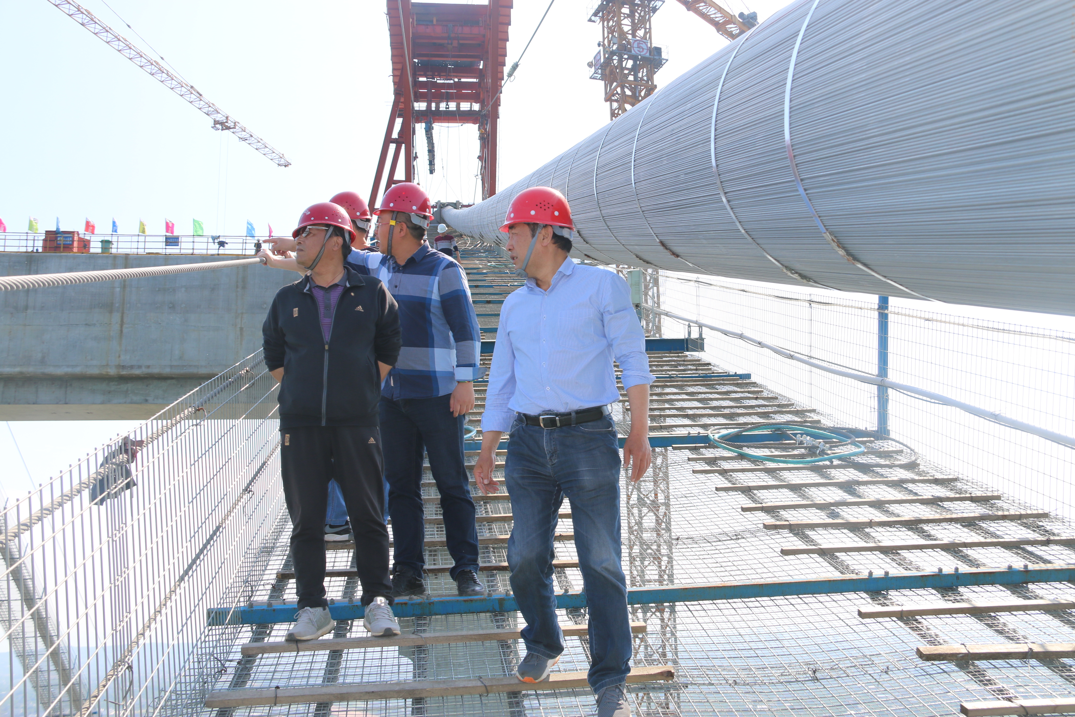 蔡明征一行抵达项目后,在项目经理张清利、项目书记王康明的陪同下,先后察看了白洋长江大桥主塔主缆架设、锚碇工程和预制梁场施工现场,实地了解了项目施工进展及当前存在的问题。
