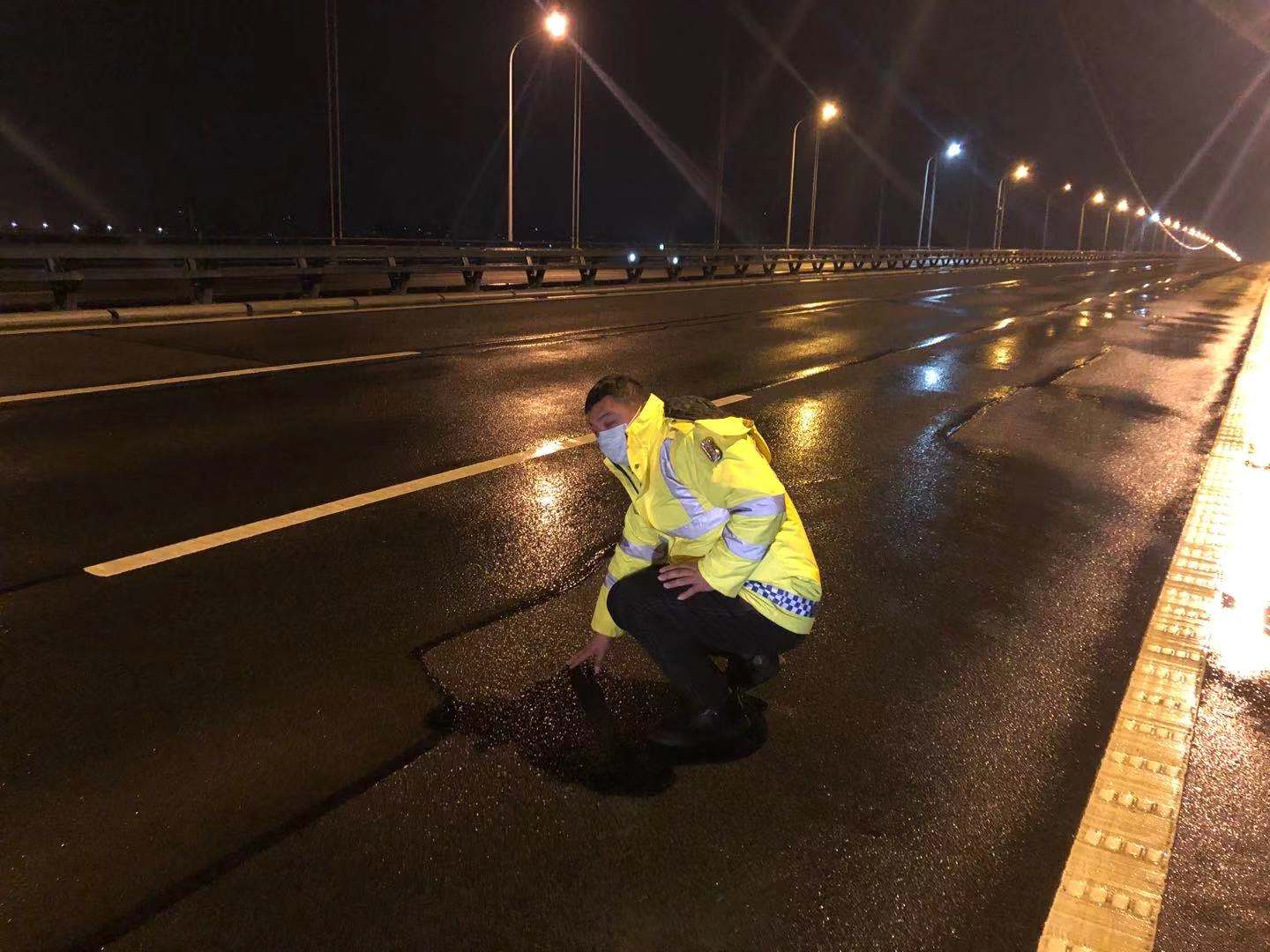 图:巡查人员夜间检查桥面温度