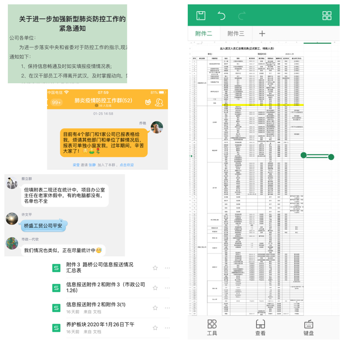 各职能部室、分子公司和项目部纷纷响应,各级工会组织积极引导广大职工群众投身疫情防控阻击战。领导干部统筹协调、靠前指挥,分管同志守土担责、守土尽责,从大年初一(1月25日)到正月十八(2月11日),对全集团员工开展摸底,每天日报,密切关注疫情防控、全力做好疫情排查监测,形成一人一档,防止疫情扩散。此项工作将延续到疫情结束,全力以赴筑起群防群治抵御疫情的严密防线。