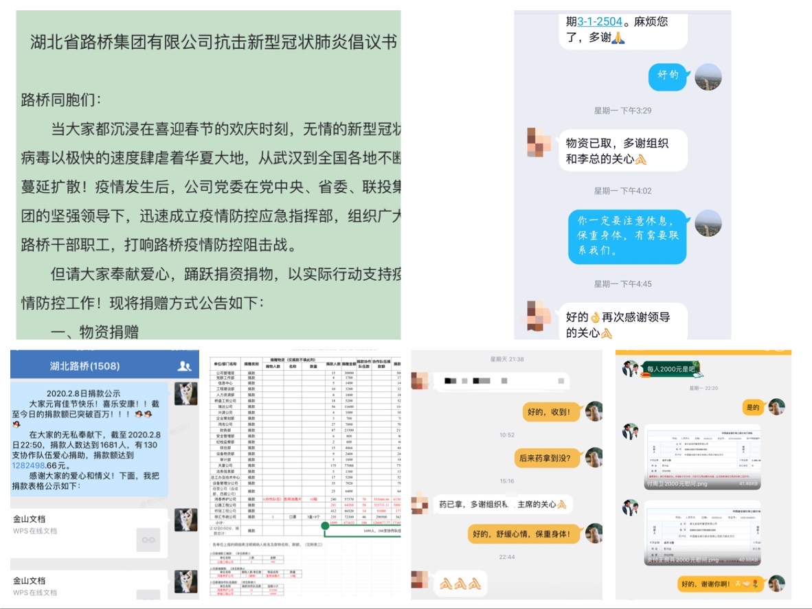 2月3日,湖北路桥工会发出《湖北省路桥集团有限公司抗击新型冠状肺炎倡议书》,各分子公司、项目部和职能部室踊跃参加,很多热心的协作队伍也闻讯而来,自愿捐款,奉献爱心。短短几天,1699名路桥职工及家人,188支协作队伍参与捐款,爱心款项达到173.45万元,目前捐款活动仍在继续,爱心还在源源不断汇聚而来。同时,天夏公司,麻安、梧桐湖、鄂咸、洪湖新滩、枝江等项目向当地政府或抗疫机构捐款捐物近165万,积极援助湖北各地政府抵御疫情!对疫情期间参与医院抢建的一线职工和值守工地的项目员工,工会送去了价值34000余元的口罩、消毒液等物资,助力一线做好防护,抗击疫情!