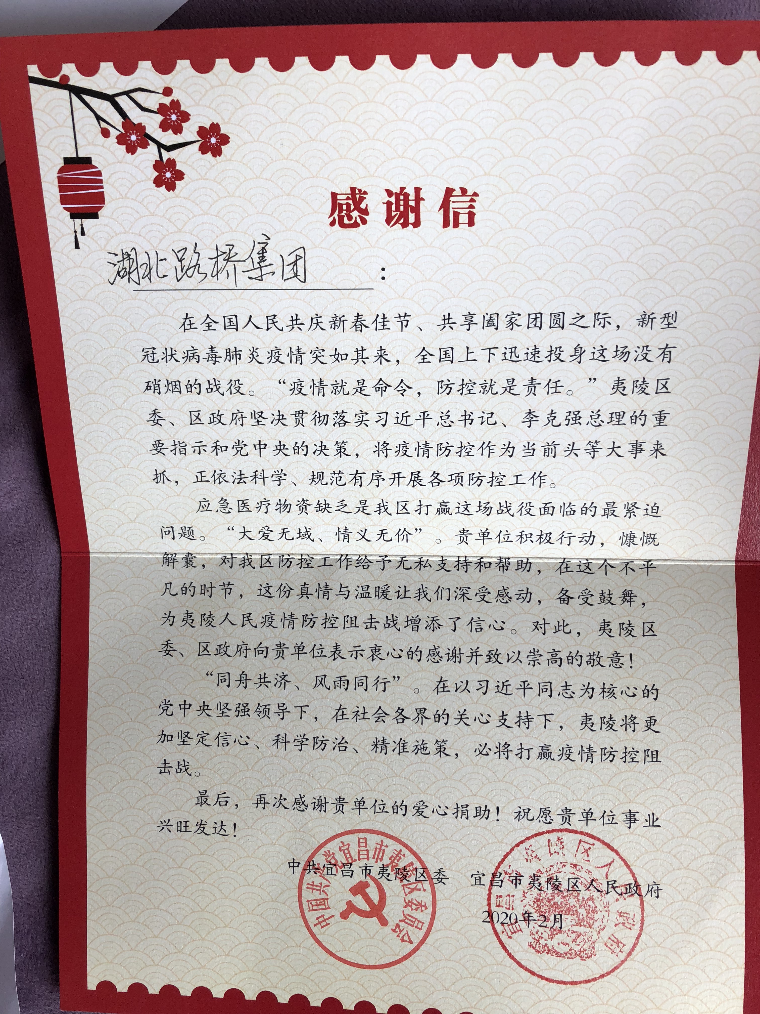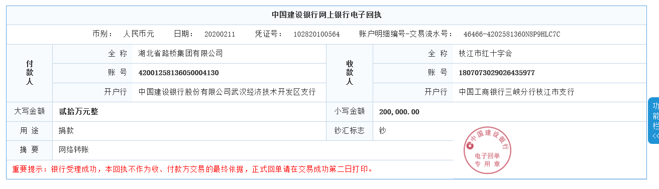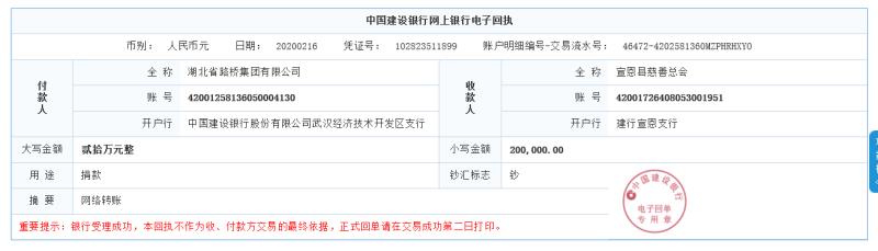 图:湖北路桥驰援枝江市(捐款凭证之一)