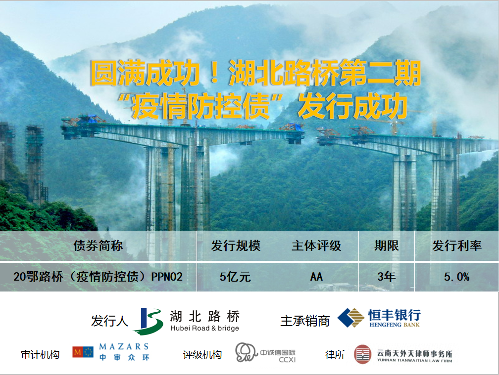 3月18日,湖北省路桥集团有限公司2020年度第二期定向债务融资工具——疫情防控债成功发行。本期疫情防控债由恒丰银行担任主承销商,发行规模为5亿元,期限3年,发行利率5.00%。加上3月16日成功发行的第一期“疫情防控债”,湖北路桥首单“疫情防控债”全部成功发行,圆满落幕,为公司抗击疫情、复工复产注入10亿元资金强劲动力。