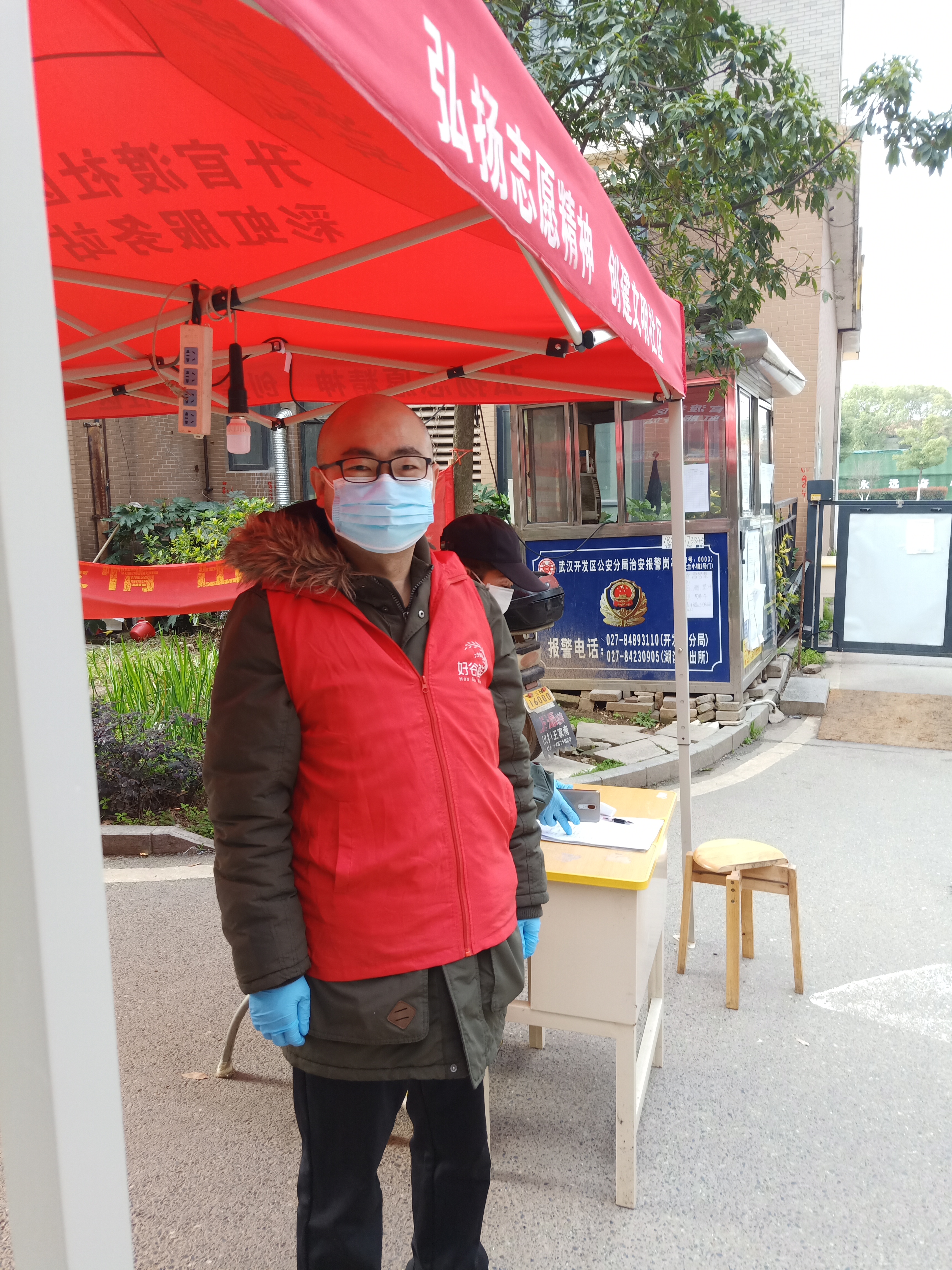 王进超,湖北路桥瑞达公司材料部副部长。在疫情期间他一直配合社区做志愿服务工作,分发爱心物资、小区巡逻、社区岗亭站岗这些都是他的日常工作。谈及到社区当志愿者的初衷,他说:“我是武汉人,家乡遭难,不能坐在家里无动于衷,我要为武汉战‘疫’出一份力。”