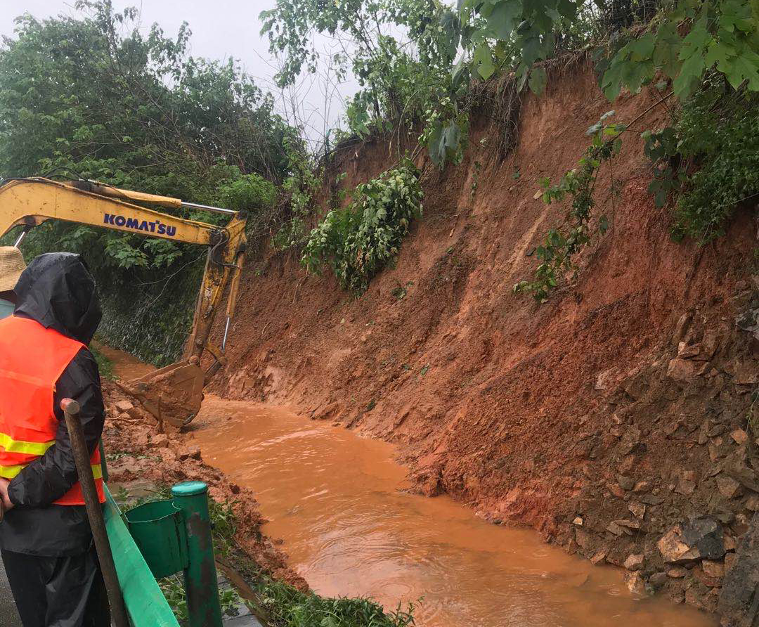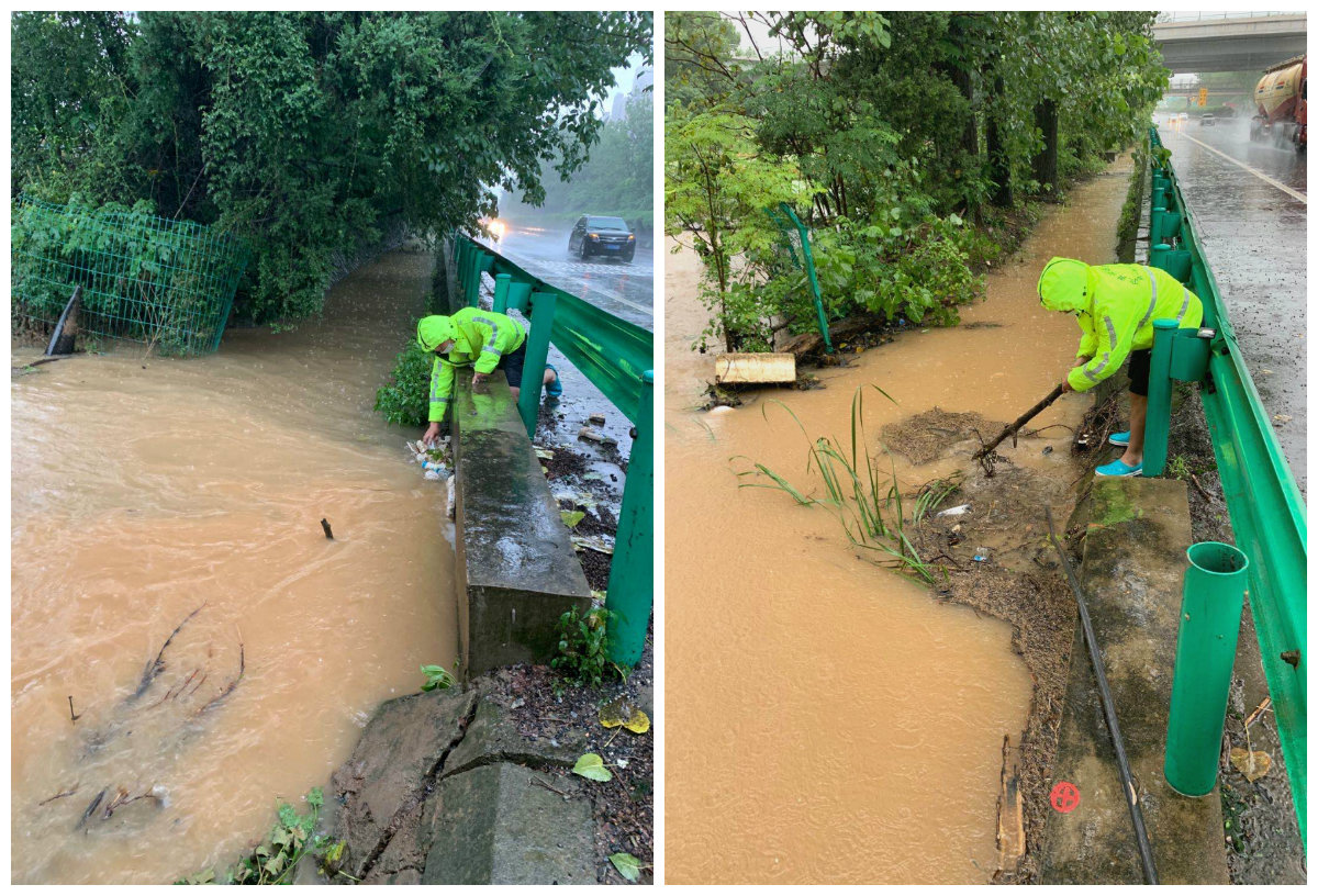 时至中午12时,强降雨仍势头不减。持续超负荷的降水,导致部分路段出现边坡垮塌、水位漫过路面等紧急情况,项目部全员出动,沿线巡查,发现积水严重的通道及时组织人员排涝清理。