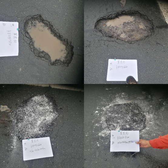 下午三时许,降雨短暂停止。项目部紧急调动人员对持续降雨形成的路面坑槽进行临时修补,避免行车隐患,有效预防交通事故发生。