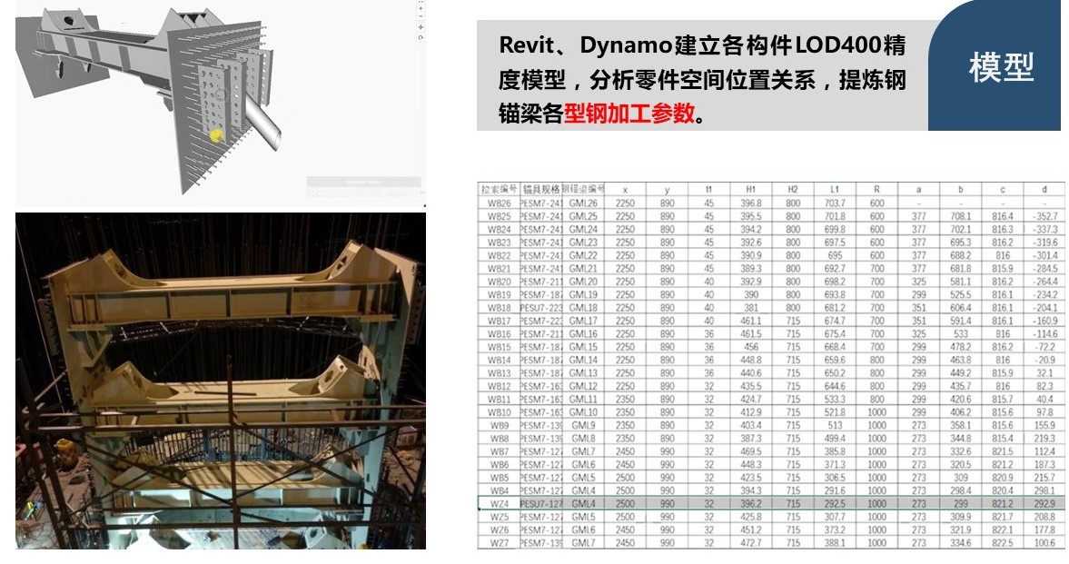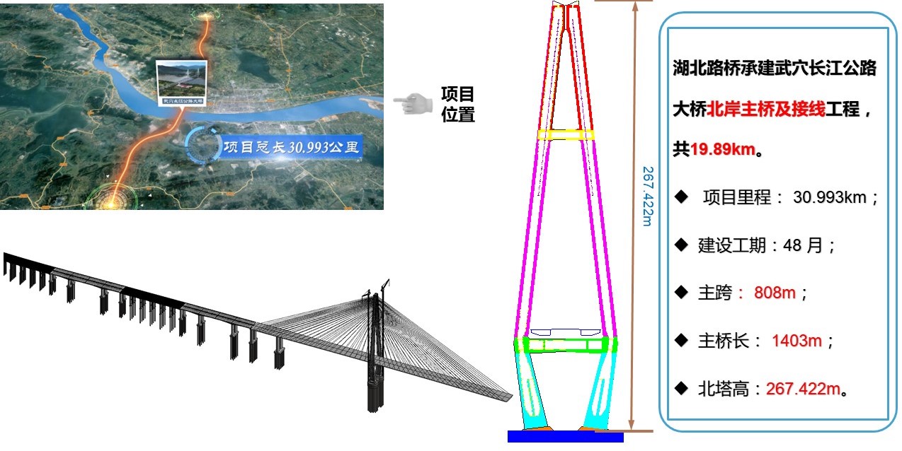 武穴长江公路大桥建设里程30.993千米,湖北路桥承建大桥北岸主桥及接线工程共19.89千米。大桥主跨808米,主桥长1403米,北塔高267.422米,各项参数均位于世界同类型桥梁前列。武穴长江公路大桥BIM参数化设计与施工管理应用,主要包括以下方面:第一,双壁钢围堰BIM参数化设计,确定结构最优设计参数,节约钢材用量;第二,搭建主塔钢锚梁参数化模型,提炼钢锚梁各类型钢加工参数,模拟实际施工工况;第三,推导及应用斜拉索索力与线型公式,减少近似计算误差,指导大桥斜拉索施工。