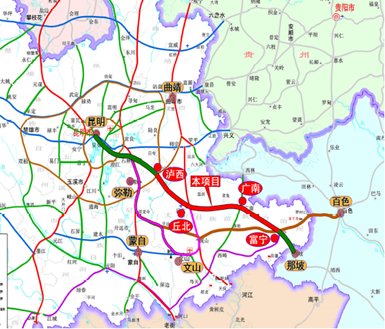 “泸丘广富”高速公路项目概况:泸西至丘北至广南至富宁高速公路全长268.002公里,项目估算总投资为489.74亿元。起点位于红河州泸西县城西侧,接在建泸西至弥勒高速与石林至泸西高速相交的逸圃枢纽互通,止点位于文山州富宁县城西侧的各甫村附近,设枢纽互通接G80广昆高速。路线自北向东南途径红河州泸西县、文山州丘北县、广南县及富宁县,文山州境内247公里概算投资440亿元,是文山州有史以来建设里程最长、投资额度最大的地方高速公路。