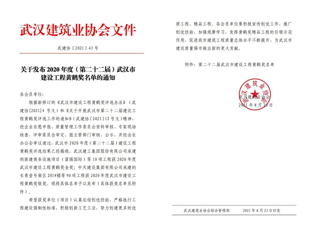 近日,武汉市建筑业协会对2020年度(第二十二届)建设工程黄鹤奖评选结果公示,公司承建的龙苑澜岸三期B-2区36#楼、政通壹公馆一标段1#楼两个项目一路“过关斩将”,在众多参评项目中脱颖而出,荣获武汉市建设工程“黄鹤奖银奖”。