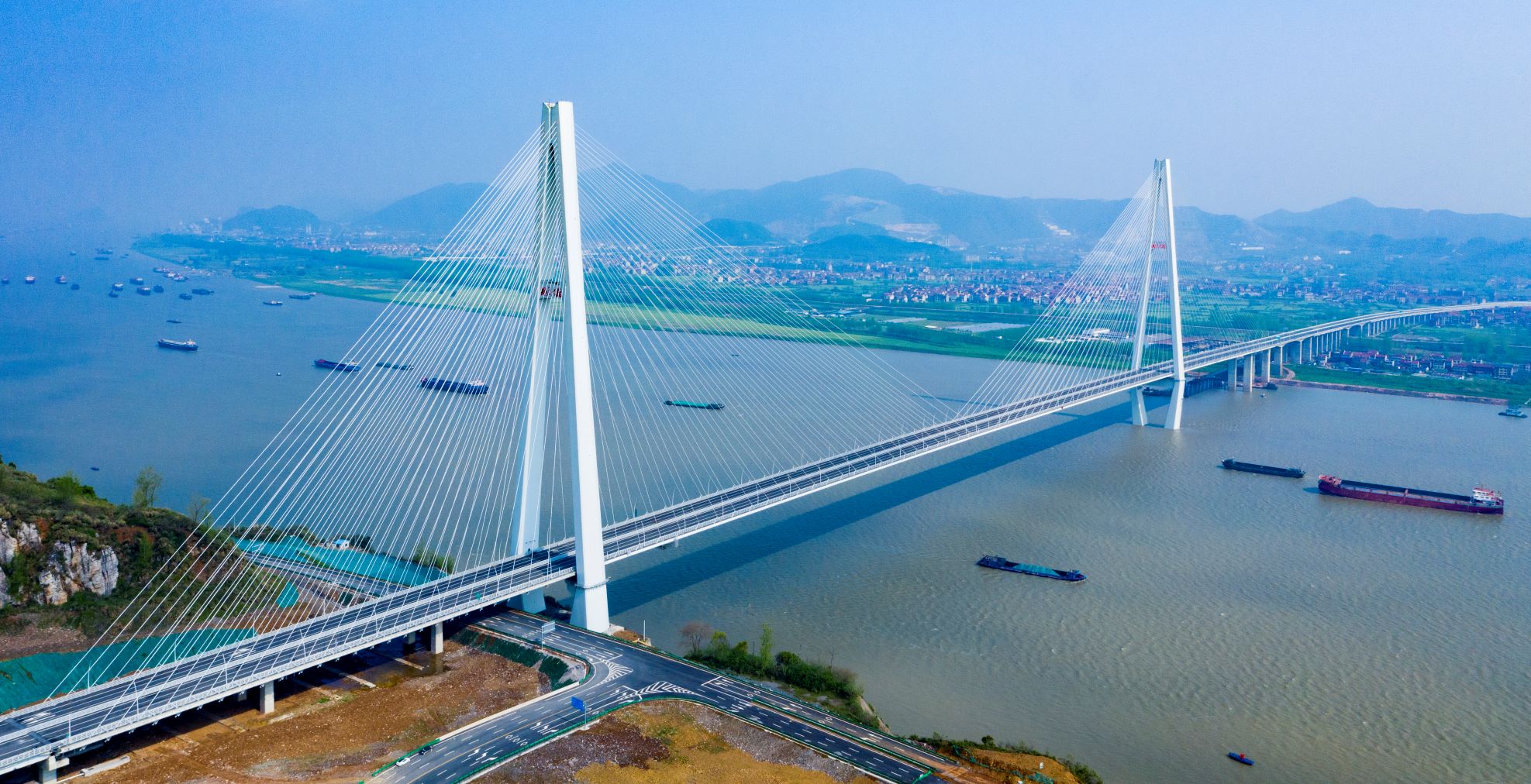 武穴长江大桥北岸是武穴市,南岸是阳新县,是单侧钢混组合梁斜拉桥,主桥全长2051.5米,其中,斜拉桥长1403米,主跨808米,跨径位列世界同类桥梁第七位。大桥通车后,驱车仅5分钟即可过江,极大缩短了两地的时空距离,实现了两地人民千百年来的“大桥梦”。