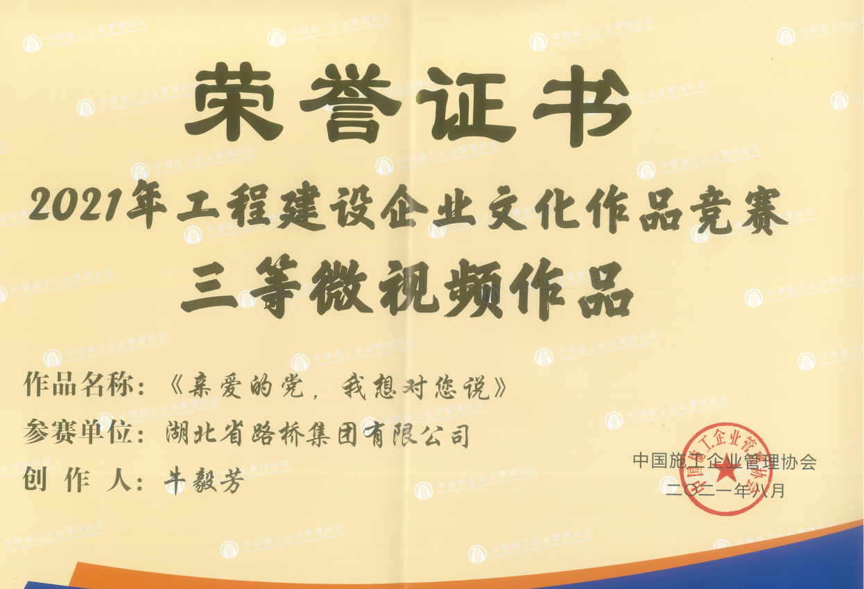 10月24日至26日,2021年度全国工程建设企业文化成果交流会在山东省济南市举行。湖北路桥喜获两项2021年工程建设企业文化作品竞赛荣誉。