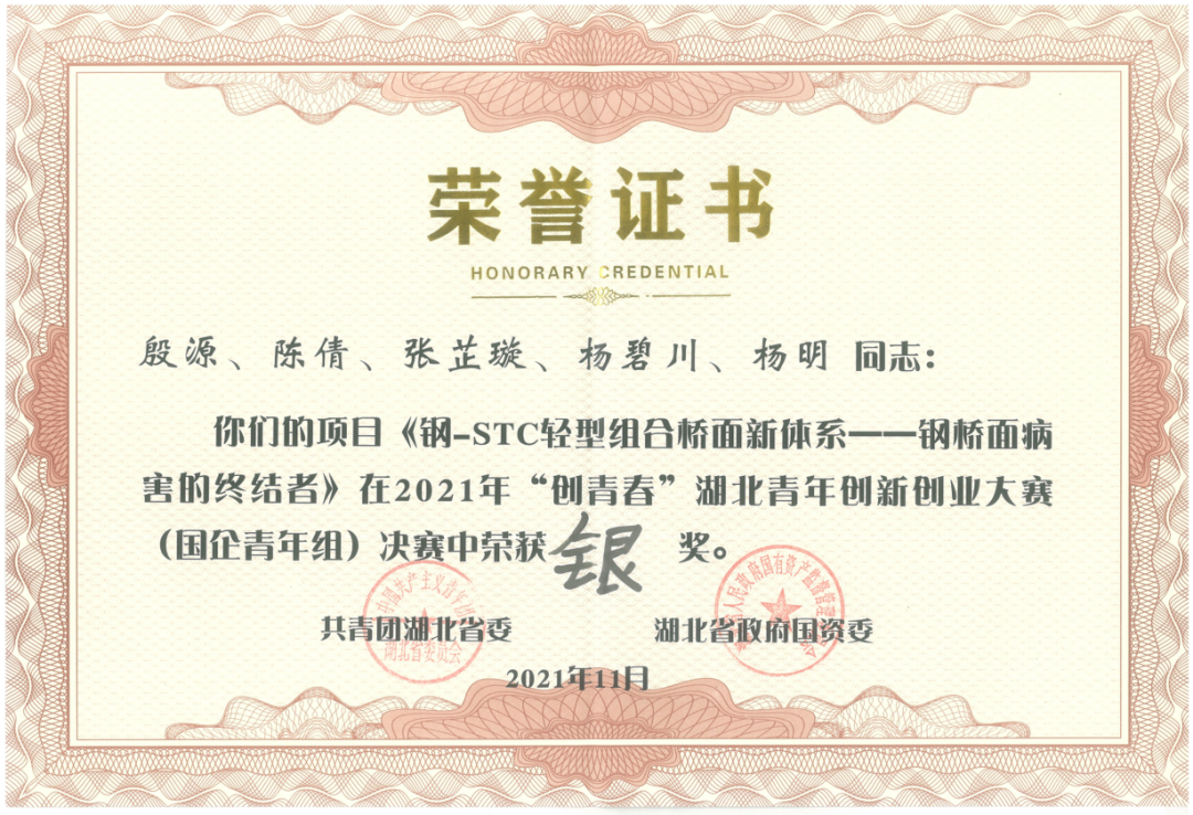11月12日,2021年“创青春”湖北青年创新创业大赛(国企青年组)决赛在武汉中铁大桥局总部举行,湖北路桥团队的《钢-STC轻型组合桥面新体系——钢桥面病害的终结者》荣获银奖。