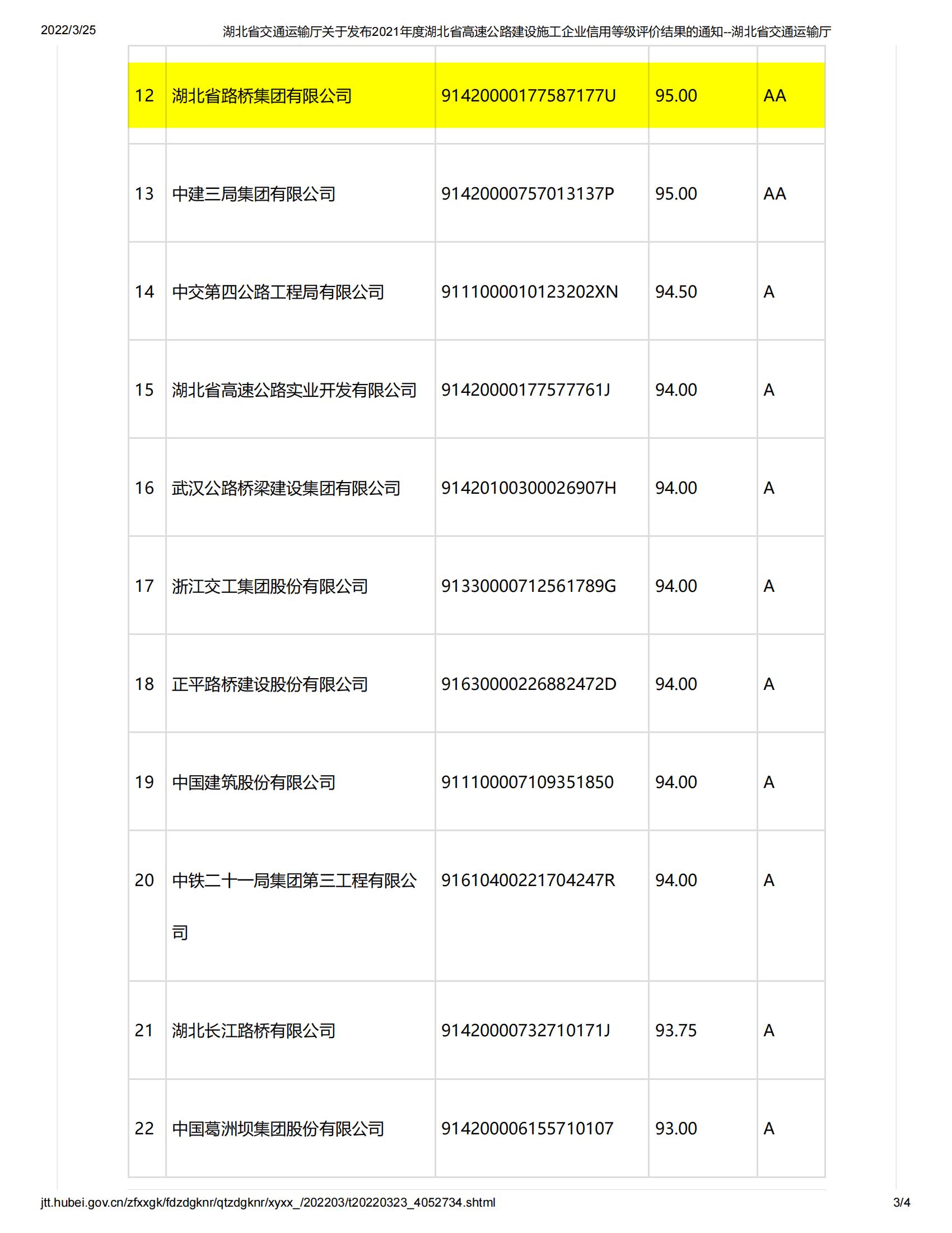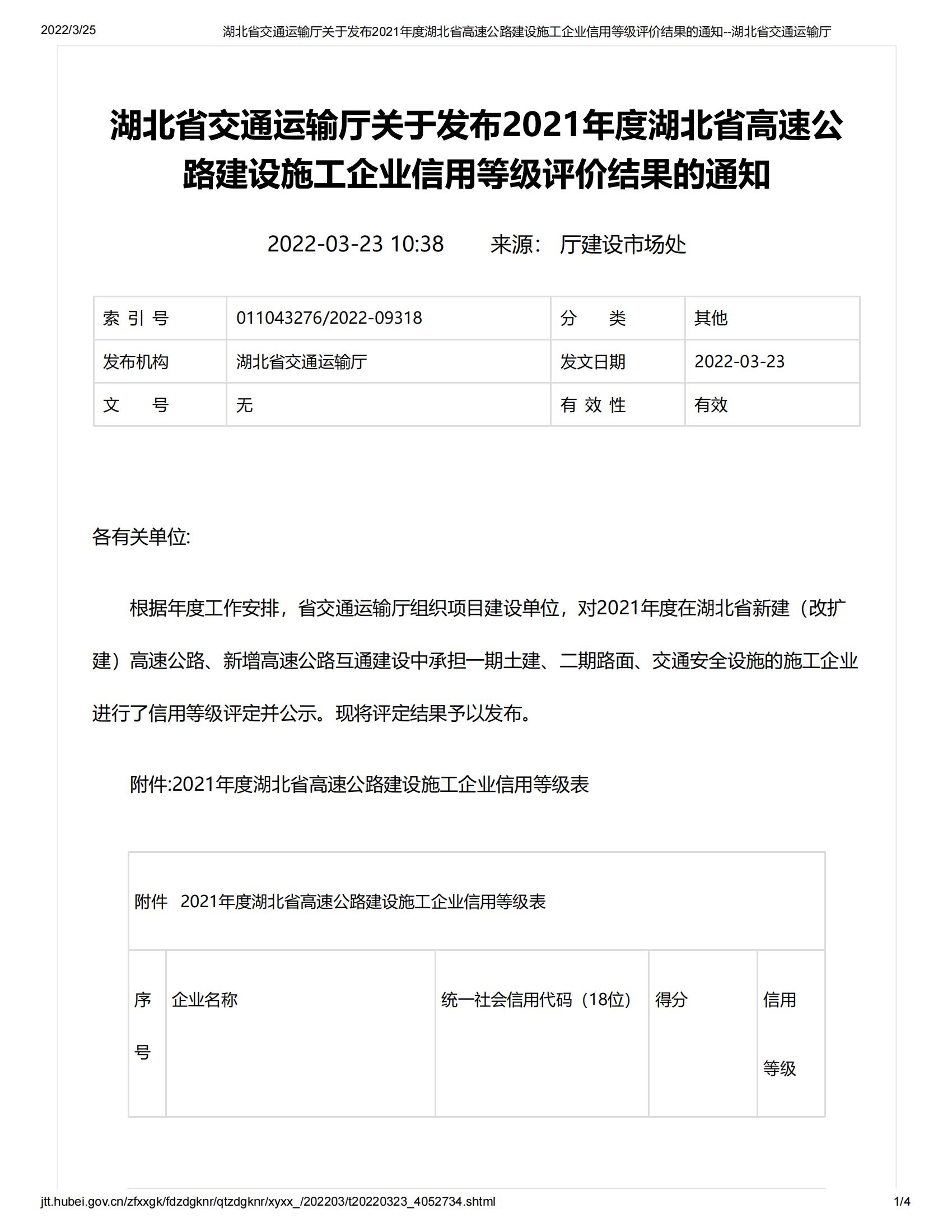 3月23日,湖北省交通运输厅公布2021年度湖北省高速公路建设施工企业信用等级评价结果,湖北路桥被评为“AA”级(最高等级)施工企业,公司已连续四年获此殊荣。