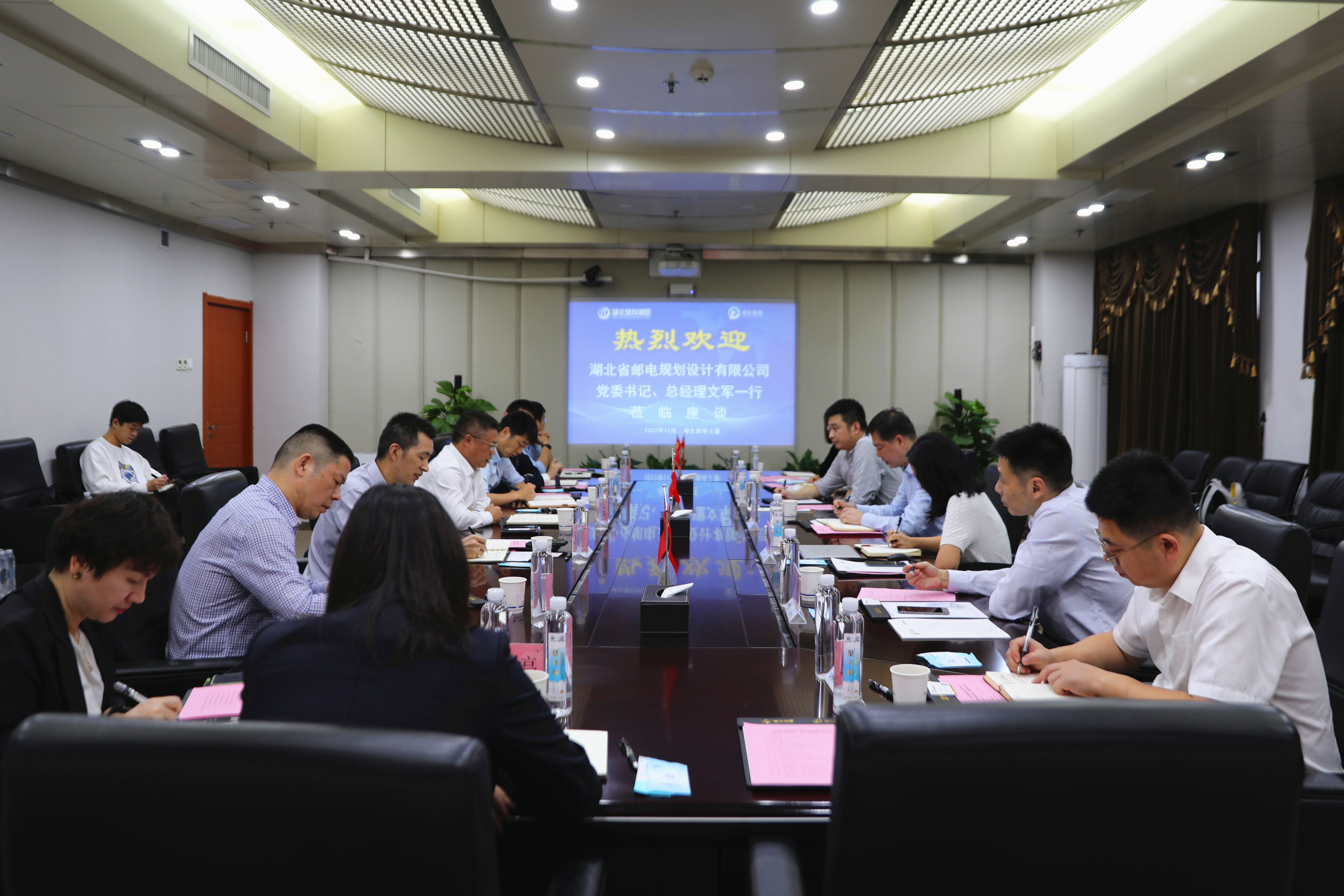 11月11日,湖北省邮电规划设计有限公司党委书记、总经理文军一行到访建投集团、湖北路桥,重点就深化双方业务合作,与公司党委副书记、总经理潘新平展开洽谈。