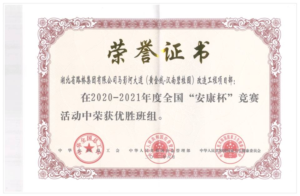近日,由湖北省路桥集团有限公司承建的马影河大道(黄金线—汉南碧桂园)改造工程项目喜获全国“安康杯”优胜班组荣誉称号。