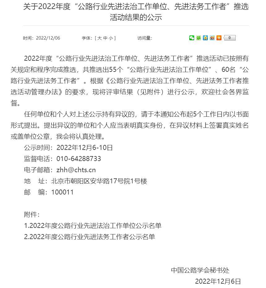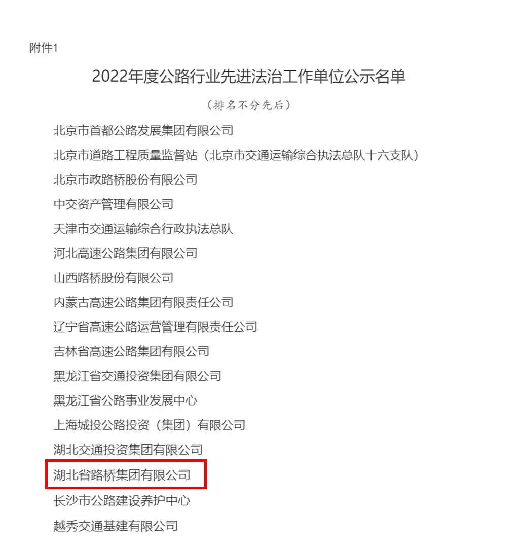 近日,中国公路学会公布了2022年度“公路行业先进法治工作单位、先进法务工作者”推选活动名单,湖北路桥荣获“2022年度公路行业先进法治工作单位”荣誉称号,这是湖北路桥首次斩获国家级先进法治建设荣誉。