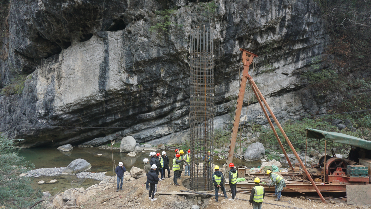 铜岩屋中桥是该项目5座新建桥梁其中之一,桥梁全长102m,净宽9.5m,灌注桩基础12根,此次施工桩基设计桩长18m,直径为1.4m,施工地段位于山脚,毗邻河道,施工场地狭窄,地形、地质较为复杂,施工条件差、难度大。项目部始终秉承“科学化管理,标准化操作,精细化推进”的施工方针,精心组织、周密安排,确保首根桩基顺利浇筑,项目全线桥梁桩基施工正式驶入“快车道”,为项目高质量开好2023年建设新局面奠定了坚实基础。