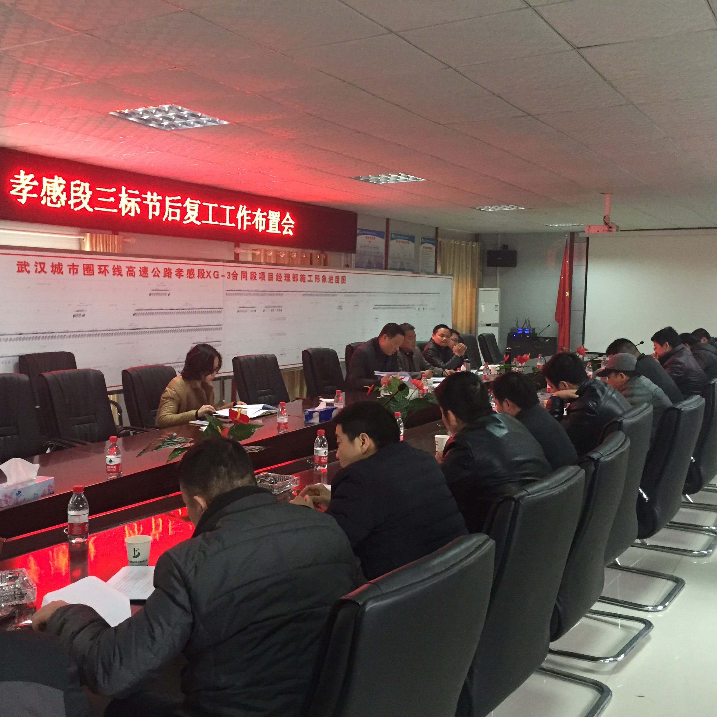 2016年2月23日,孝感段三标项目部召开节后复工工作布置会。项目经理汪伟主持会议,项目部班子成员、各部室负责人、工区长参加了会议。