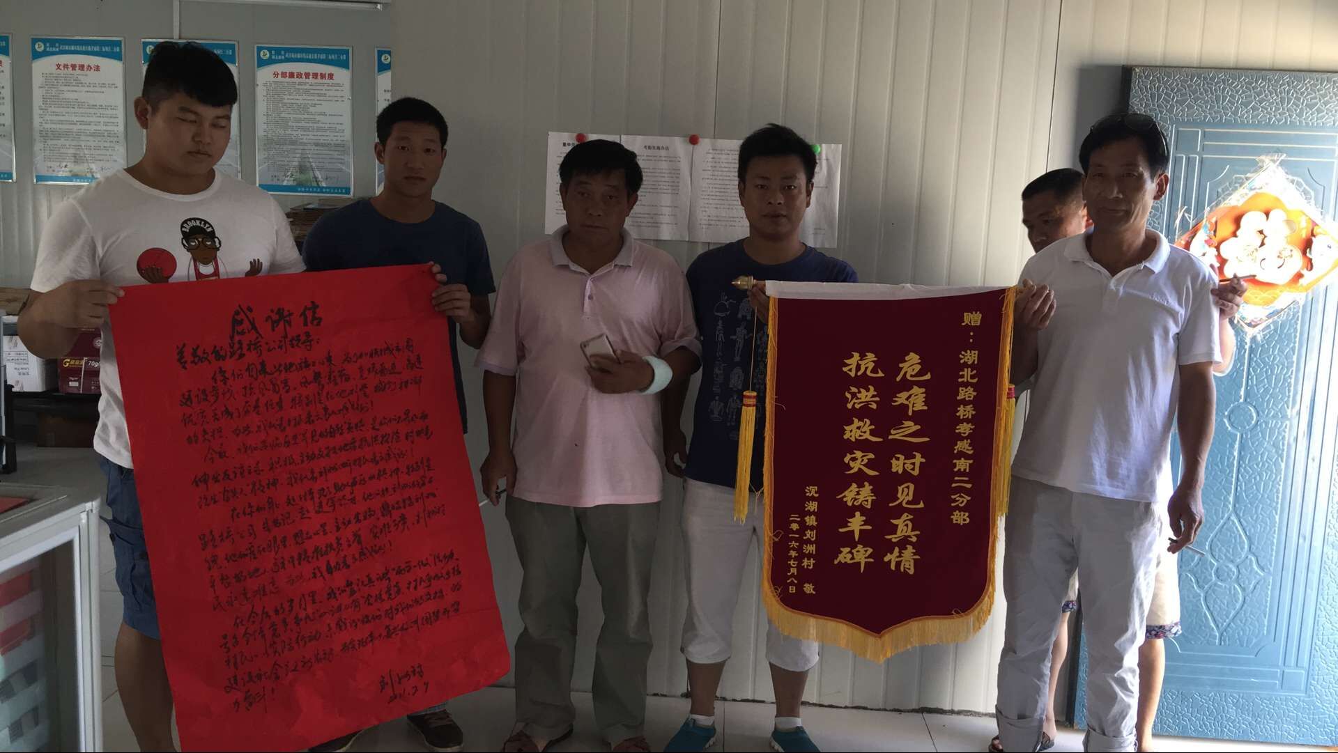 孝感段三标项目部在防汛抗洪的紧急时刻顾全大局、迅速行动,得到了市协指、防汛部门的充分肯定,地方镇政府、村委会送来了感谢信和锦旗。2016年入汛早、暴雨过程多、强度大。据气象台预报,7月10日后汉川境内又有强降雨,孝感段三标党员干部与全体员工将继续坚守一线,发扬"98抗洪精神",坚决夺取抗洪救灾的最后胜利。