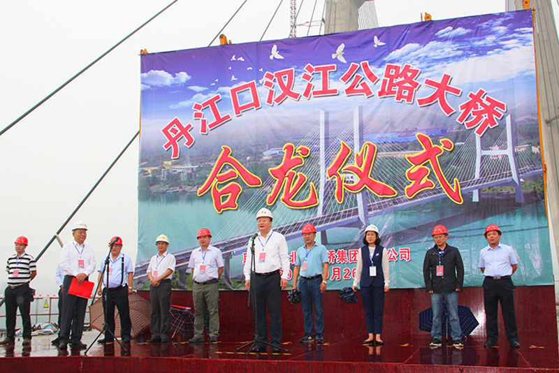 由路桥集团投资承建的湖北省丹江口市丹江口汉江公路大桥主桥于2016年9月26日上午9点08分胜利合龙。 丹江口汉江公路大桥位于丹江口大坝下游6km处,南接丹沈路,北接沿江大道(孟土路),是丹江口市一座地标性建筑和生态景观桥,也是丹江口市重点项目之一。该桥为双塔斜拉桥,全长929米,其中大桥长760米,桥面宽24.5米,采用一级公路标准,设计车速80km/h,投资总估算4.4亿元。 该合龙仪式的举行,标志着大桥主体完工,为年底大桥通车打下了坚实的基础。